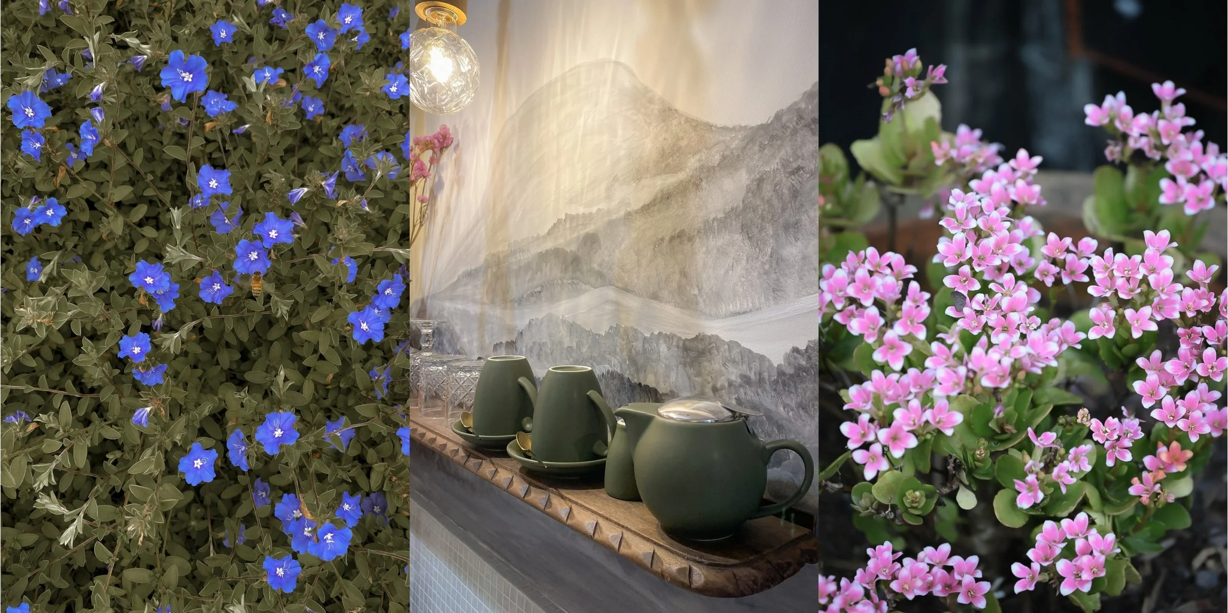 Hosted and styled by artist Jacqui Stewart, explores a thoughtfully curated collection of floral-infused décor and botanical art display spanning the 19th to the 21st century. Inspired by European and Scandinavian interiors, fresh white walls, monochrome painting of Mt Ninderry and the Glasshouse Mountains, concrete flooring, a terrazzo basin, glass mosaic benchtops complemented with vintage wood furniture and a mix of old and new collections from flea markets and local finds.